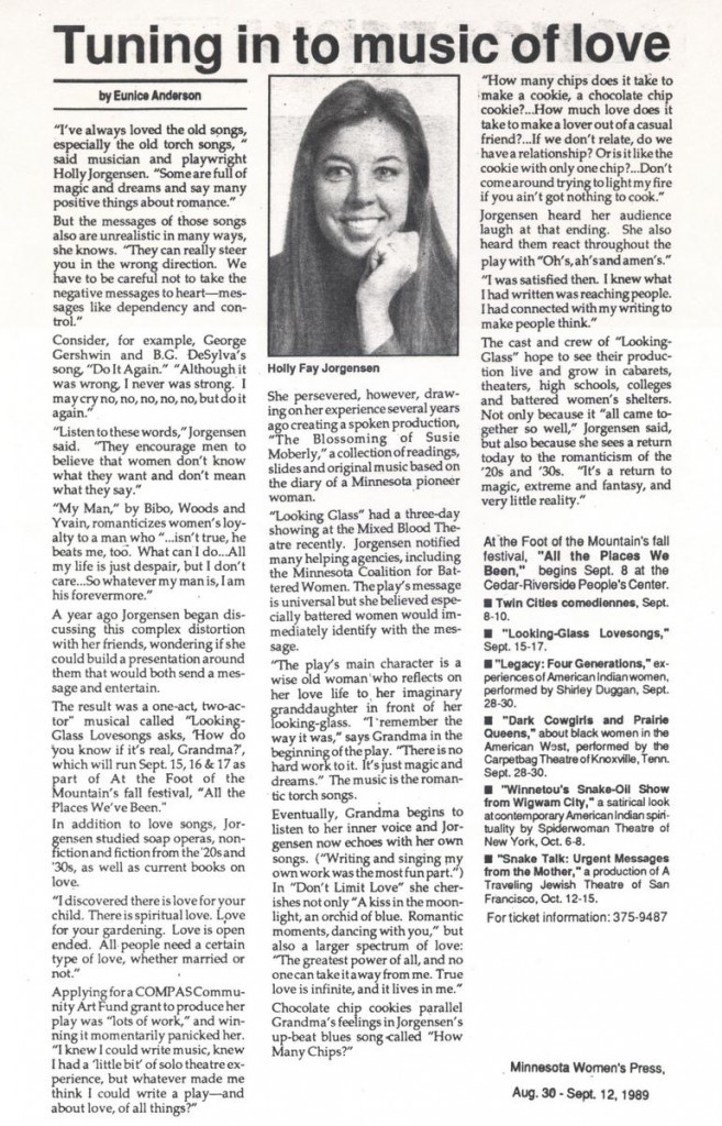 I LOVED singing, especially jazz standards and the blues. But it didn’t take very long for me to tire of the bar scene. So I wrote myself a little play and a few more songs. With the incredible support of Jack Reuler and grants from COMPAS Community Arts and the General Mills Foundation, I hired some fine folks- an actress, director, lighting designer, and three musicians. With a bevy of family and friends doing a gazillion little and big things I didn’t even know went into a stage production, we put it on. Just one weekend at the Mixed Blood Theatre, then another At the Foot of the Mountain. Not a long run, but a very deep experience. Hearing not only applause, but silence, sighs, and laughter in the right places told me that what I had written was connecting with others. Powerful. The story was a simple coming-of-age-in-song tale. I got to sing the torch songs I loved, but with the added footnote: these songs are not good dating advice! Beverly Smith-Dawson did a great job as the grandmother recalling her youth and sharing her wisdom with her granddaughter. My psychologist friend Mary brought a women’s group, and further affirmed the importance of the message: when it comes to love, write your own songs.